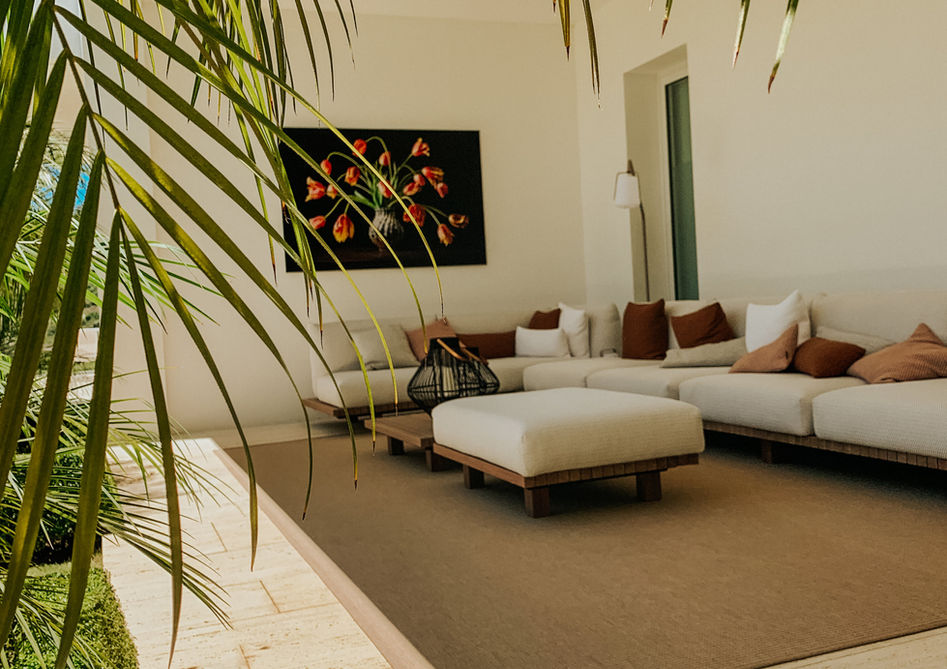 The villa’s spacious bedrooms, each with an en-suite bathroom, provide ultimate comfort, while the expansive living room, with its plush sofas and inviting atmosphere, is perfect for unwinding. Outside, the terrace offers a variety of tempting spots: an outside kitchen with barbeque, a long dining table for memorable meals, and cosy seating areas for relaxation. Every corner invites you to savour the stunning views and the perfect balance of sun and shade.